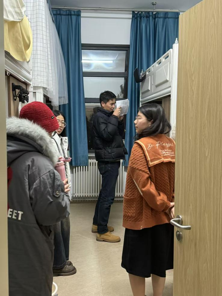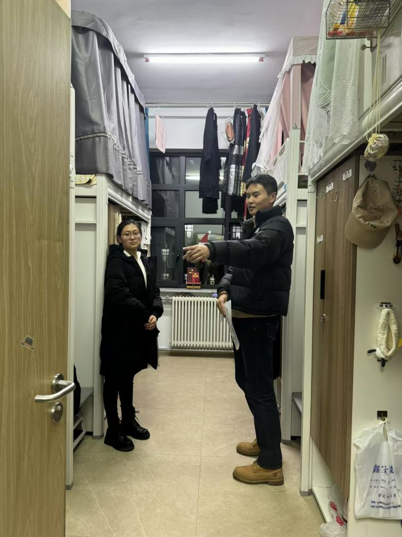 于2024年11月27日17:00开展研究生公寓卫生安全检查工作,研究生辅导员依德日贡老师走访学院研究生寝室,检查宿舍内务卫生及安全隐患。